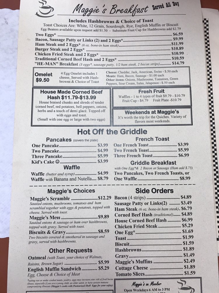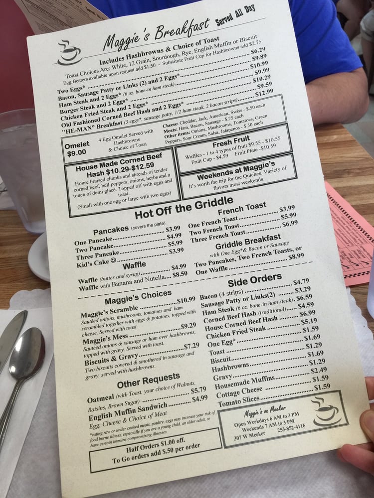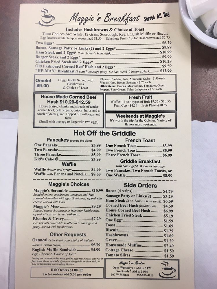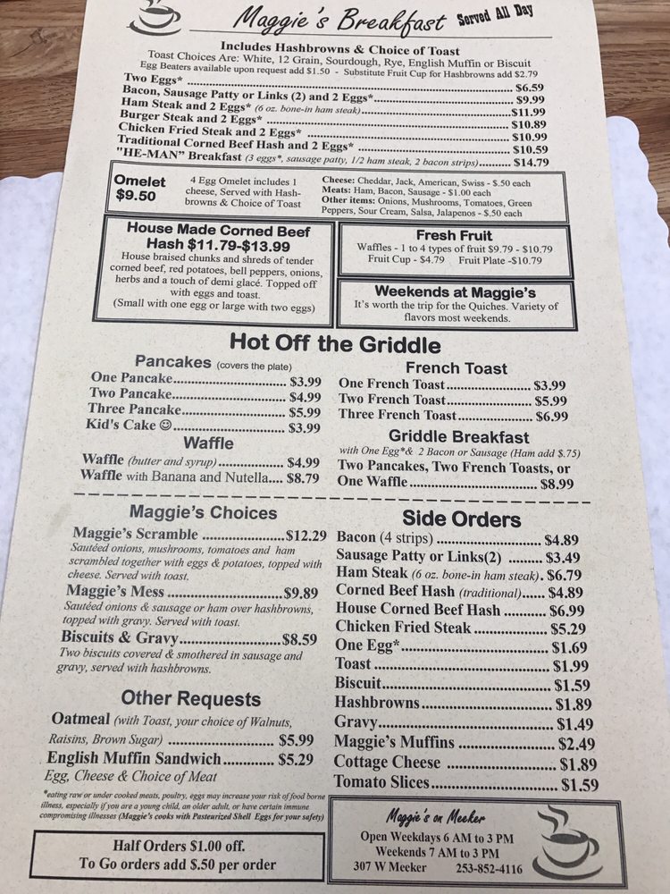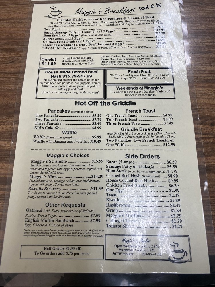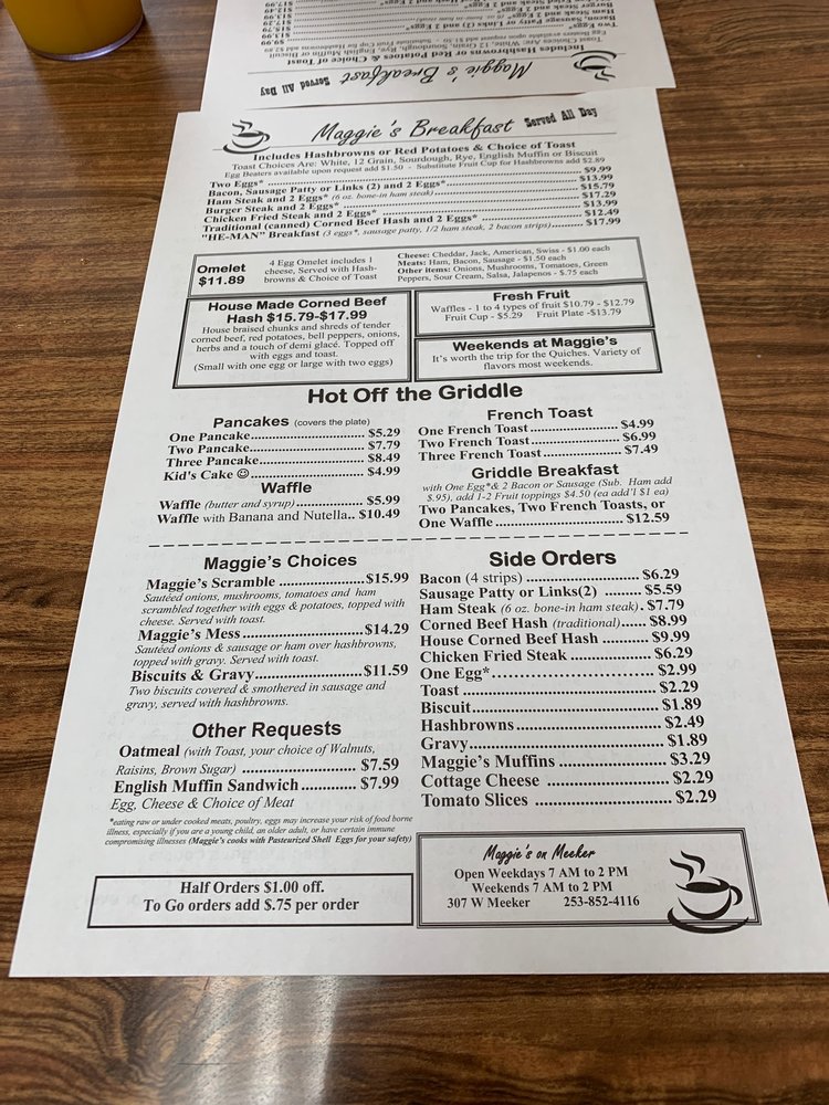 Maggies On Meeker is a popular breakfast and brunch spot located in Kent, WA. They offer a wide range of delicious menu items such as Maggie's Scramble, Maggie's Mess, Biscuits and Gravy, and House-Made Corned Beef Hash. Customers rave about the generous portion sizes, friendly service, and affordable prices. The restaurant is known for its cozy and welcoming atmosphere, making it a favorite among locals and visitors alike. Whether you're craving a classic American breakfast or looking to try something new like the Crab and Mushroom Omelet, Maggies On Meeker has something for everyone. Don't forget to check out their all-day breakfast options and happy hour specials for a truly satisfying dining experience.